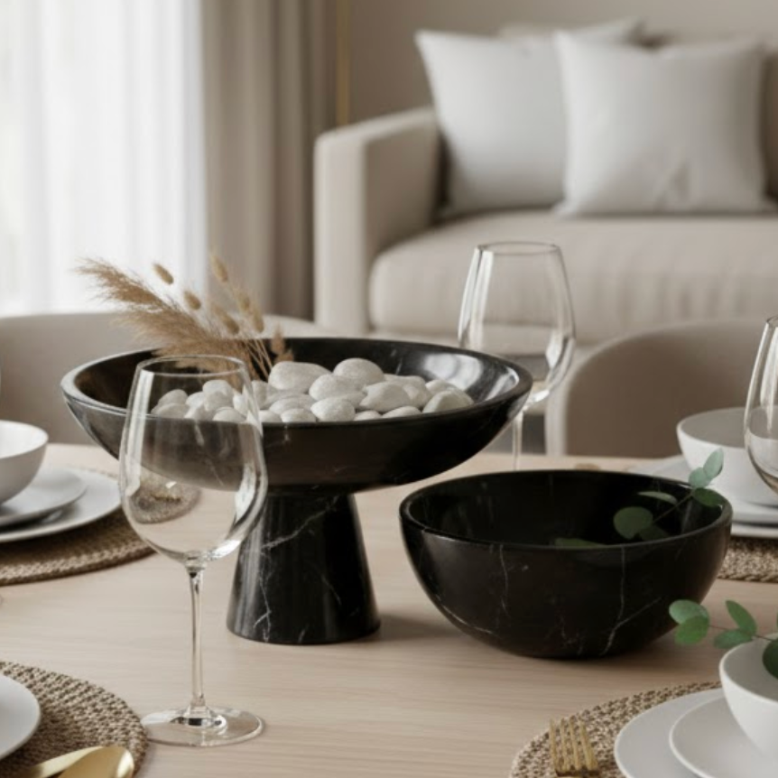 Black Marble Bowl Set (Pedestal & Flat, 2 Pieces – Handcrafted)