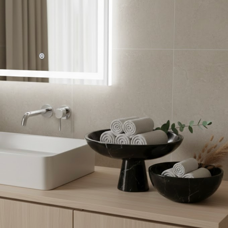 The Black Marble Bowl Set from Meridian Concept brings together sculptural form and refined simplicity in a balanced two-piece composition. Handcrafted from 100% natural Toros black marble, this set pairs an elevated pedestal bowl with a compact flat bowl, offering versatility for both serving and decorative styling. The polished, glossy surface enhances the depth of the stone, while natural veining ensures each piece is uniquely distinctive.