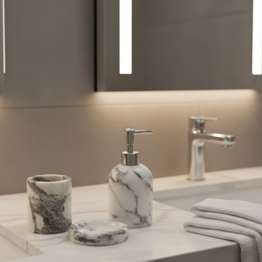 Designed for both functionality and visual harmony, the set includes a liquid soap dispenser, a toothbrush holder, and a solid soap dish. The durable marble structure ensures long-lasting use, while smooth, easy-to-clean surfaces support hygienic daily routines. A statement choice for modern, artistic, and classic interiors alike.