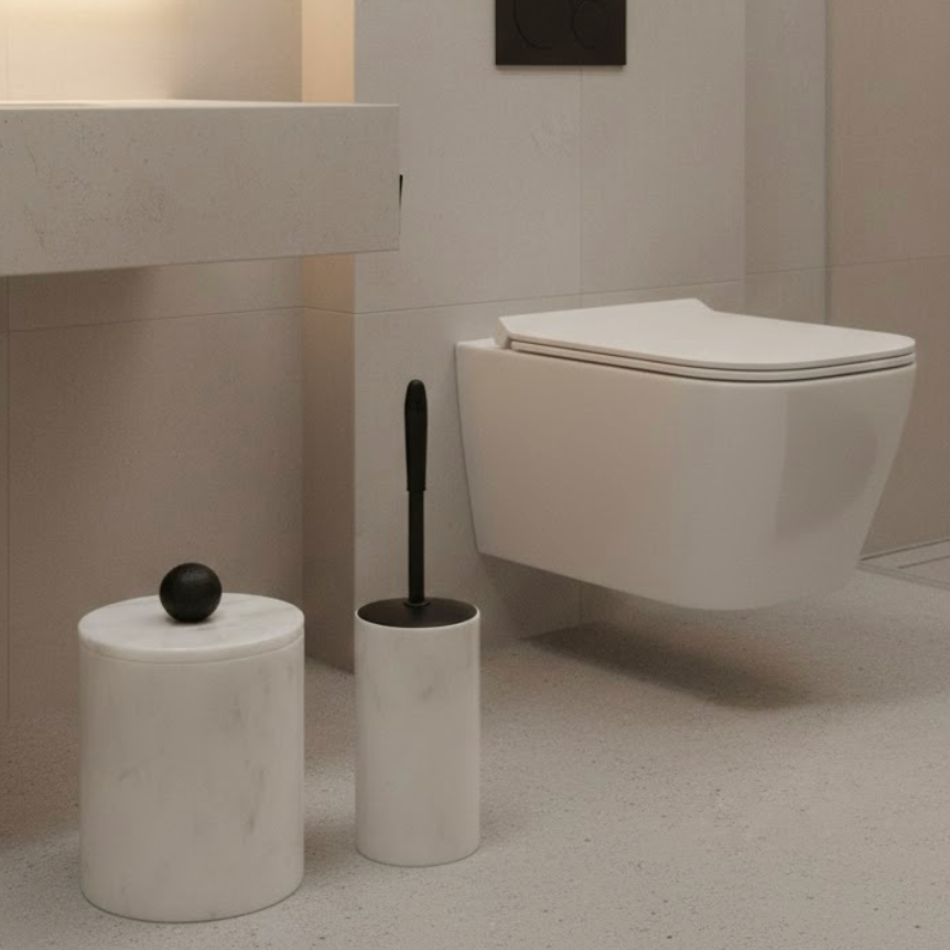 Designed for both aesthetic impact and daily functionality, the set offers a balanced and sophisticated solution for WC areas. The solid marble construction ensures long-lasting durability, while smooth, easy-to-clean surfaces support a hygienic and organized bathroom environment.