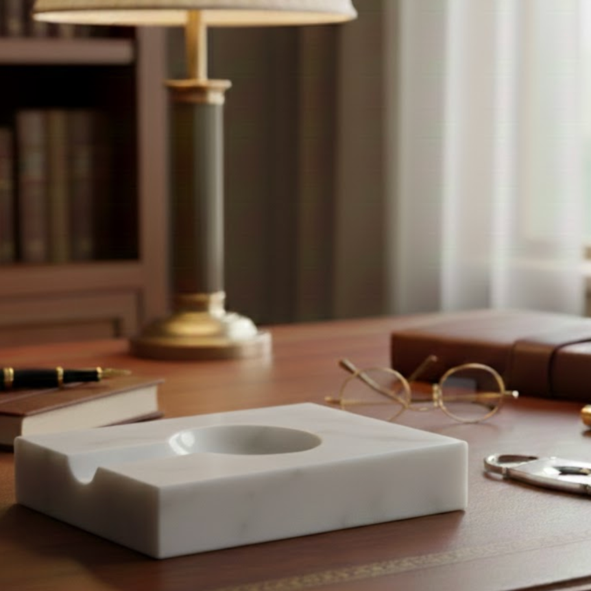 Handcrafted from 100% natural white marble, this cigar ashtray features a clean rectangular form measuring 15 × 9 × 3 cm. Its bright stone tone is enhanced by subtle natural veining, giving each piece a unique and sophisticated appearance. The solid marble structure provides excellent stability, making it ideal for relaxed and comfortable cigar moments.