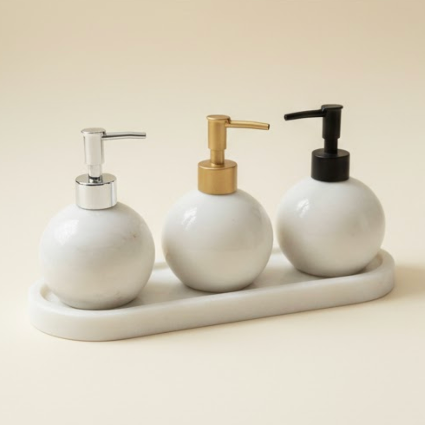 Designed as a complete countertop solution, the set includes three liquid soap dispensers and a matching marble tray. Interchangeable pump finishes allow you to personalize the look to your space, offering a sophisticated balance between natural stone and contemporary detail.